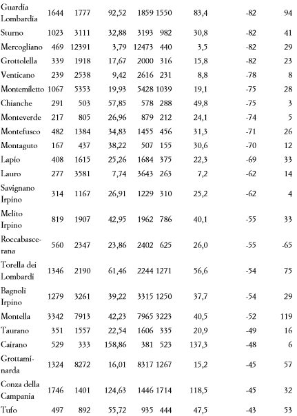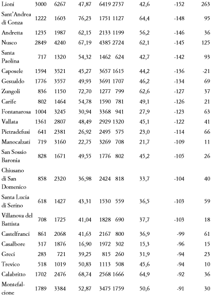 Di seguito, tutti i dati. Fonte: “L’Emigrazione e lo spopolamento”, capitolo I di “Idee per lo sviluppo dell’Irpinia” (Editoriale Scientifica), Luigi Fiorentino (a cura di).