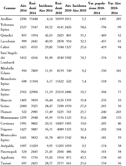 “A questa diminuzione vanno aggiunti i comuni che da anni vedono una riduzione di popolazione. Volturara Irpina dal 2010 ha perso 794 residenti; Quindici 469; Lacedonia -437; Calitri -419; Sant’Angelo dei Lombardi -374; Mirabella Eclano -330; Monteforte Irpino -318; Ariano Irpino -304 e Bisaccia -276. Ben 5 comuni perdono oltre 200 abitanti: Serino -265; Flumeri -240; Montemarano -208; Cervinara -205 e Frigento -202. Seguono 22 comuni che perdono più di 100 residenti, tra cui Montecalvo Irpino -181; Lioni -152; Nusco -145 e Villanova del Battista -103. Nel resto della provincia, altri 52 comuni con meno residenti, passando dai -99 di Castelfranci ai -6 di Capriglia Irpina. Sull’altro versante, ben 18 comuni registrano un incremento di residenti, con incidenze ovviamente di peso diametralmente diverso: Rotondi con +20; significativo il +37 della piccola Villamaina come il +78 di Vallesaccarda, fino ai più consistenti aumenti registrati a Pratola Serra +203; Ospedaletto +237 e Solofra +406”.