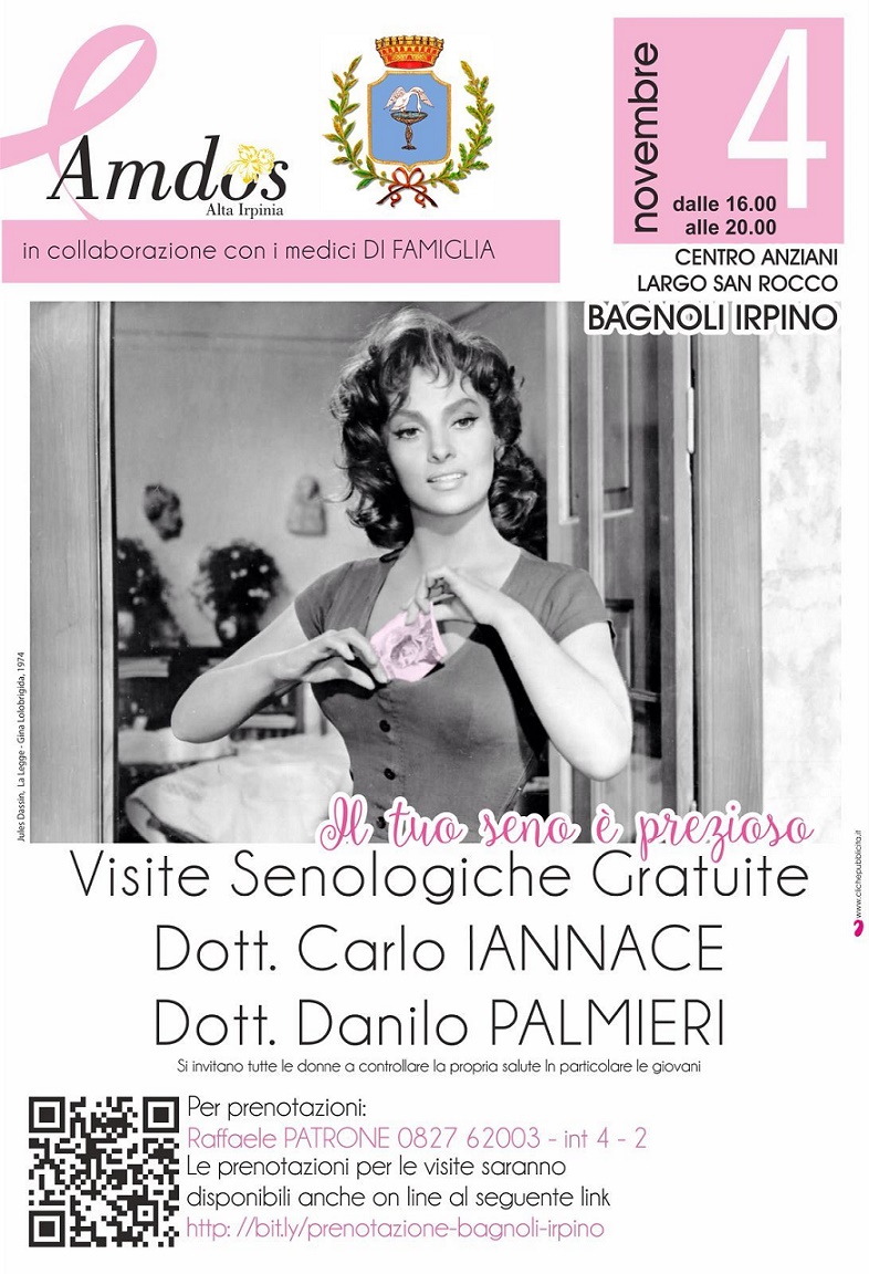 L’Amdos Alta Irpinia, con il patrocinio del Comune di Bagnoli Irpino, in collaborazione con i medici di famiglia, organizza una giornata di prevenzione gratuita. Il giorno 4 novembre, presso il Centro anziani in Largo San Rocco, sono previste visite senologiche gratuite a cura del dott. Carlo Iannace e dott. Danilo Palmieri.