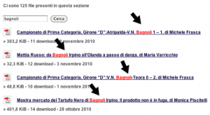 Cliccando ad esempio su “articoli vari” appaiono, in ordine cronologico decrescente, tutti gli editoriali pubblicati sul sito ed archiviati nel formato pdf. Anche in questo caso l’iter da seguire per la ricerca è analogo a quanto visto sopra. Inserendo all’interno del rettangolino a sfondo bianco la parola chiave o il nome della persona che ci interessa e premendo il pulsante a destra “cerca”, il computer inizia lo screening. Dopo pochi attimi compare l’elenco completo dei documenti (file) che contengono al proprio interno la parola o il nome della persona interrogata, evidenziata questa volta dal colore rosso.