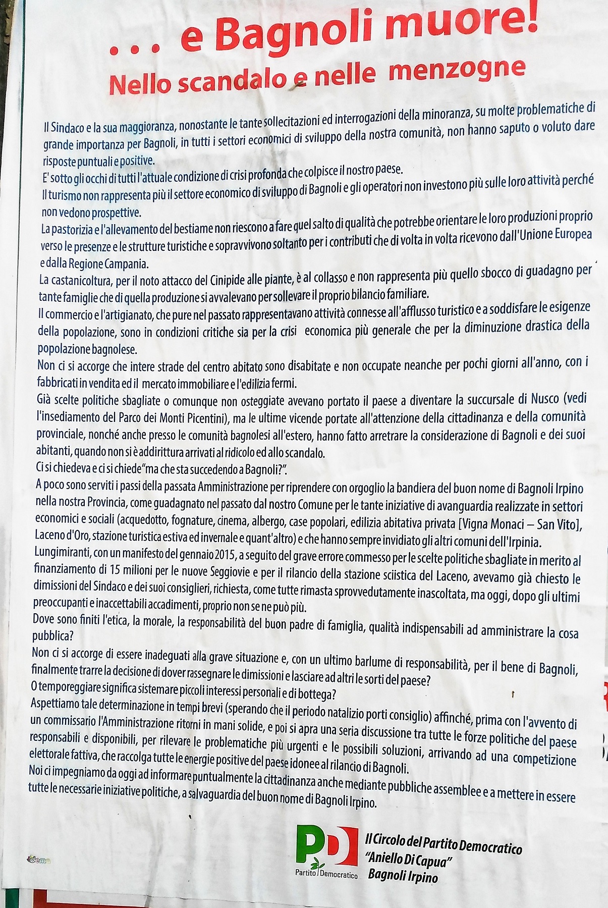 Noi ci impegniamo da oggi ad informare puntualmente la cittadinanza anche mediante pubbliche assemblee e a mettere in essere tutte le necessarie iniziative politiche, a salvaguardia del buon nome di Bagnoli Irpino.