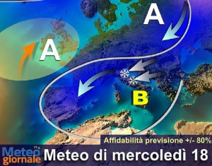 Nella giornata di mercoledì 18, ma tale previsione va riformulata, il cattivo tempo dovrebbe estendersi su tutta la regione. Avremo piogge in pianura e neve sulle zone appenniniche a quote fra i 600 e gli 800 metri. Tale “forchetta” previsionale della quota neve dipende sempre dallo spostamento della depressione, che ad oggi, è vista allontanarsi verso sud-ovest e quindi verso il mediterraneo occidentale.Temperatura in leggero aumento.