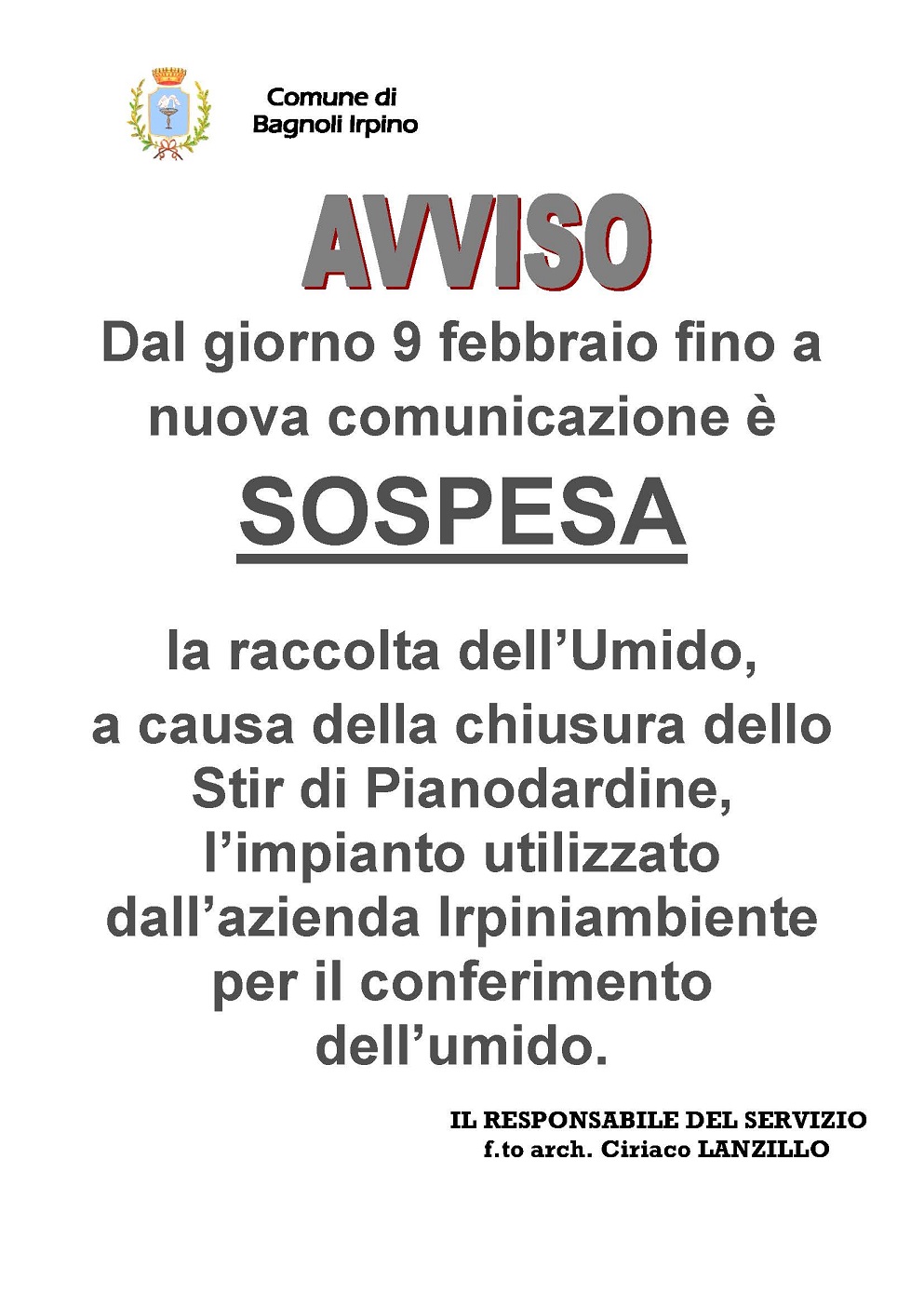 Dal giorno 9 febbraio fino a nuova comunicazione è sospesa ad Avellino e provincia la raccolta dei rifiuti organici (Umido), a causa della chiusura dello Stir di Pianodardine, l’impianto utilizzato dall’azienda Irpiniambiente per il conferimento dell’umido.