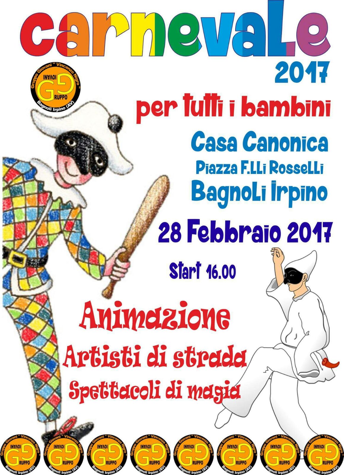 Il Gruppo Giovani V. Nigro organizza il giorno 28 febbraio 2017 una giornata dedicata ai più piccoli. Tutti insieme per festeggiare il Carnevale, quando ogni scherzo vale e ogni occasione diventa buona per divertirsi. E allora, perché non festeggiare anche insieme a genitori e parenti. Animazione, artisti di strada, spettacoli di magia e tanto altro …