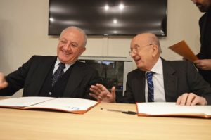 Dice De Mita: “Con la firma del protocollo di oggi, De Luca ha dimostrato di essere un uomo d’onore”. Poi aggiunge: “Si era parlato di cento milioni di euro, De Luca si è impegnato per 200 milioni”.
