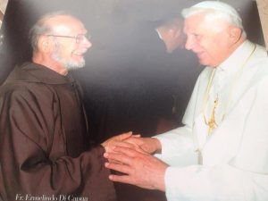 Padre-Ermelindo-e-Papa-RatzingerNel 1965 Padre Ermelindo ritornò a San Giovanni Rotondo e incominciò a fare da interprete a Padre Pio. Padre Ermelindo era solito raccontare, quando incontrava i pellegrini stranieri nell’English Office, quale fosse esattamente il suo compito: «dovevo far incontrare  Padre Pio ai fedeli e rispondere alle migliaia di lettere che arrivavano dall’estero e indirizzate a lui. Nei primi periodi gli dicevo di pregare per qualsiasi persona. Lui mi disse: “non occorre che tu me lo dica sempre, prego per tutti quanti“» tra tutti i pellegrini che incontrò, a Padre Ermelindo rimase particolarmente nel cuore Reginald :«era un uomo depresso a causa di alcuni problemi che lo turbavano. Decise di prendere l’aereo e arrivare qui solo per incontrare Padre Pio. Nonostante fosse già andato a riposarsi, bussai alla sua porta per chiedergli se avrebbe potuto ricevere un attimo me e Reginald.  Acconsentì e gli disse che avrebbe pregato per lui. Per un anno, Reginald ci mandò lettere in cui ci diceva di stare bene e ringraziava Padre Pio».  L’odore di santità del frate di Pietralcina era manifesta già prima della sua morte, come testimonia un episodio accaduto nel 1968. «una settimana prima della morte di Padre Pio»