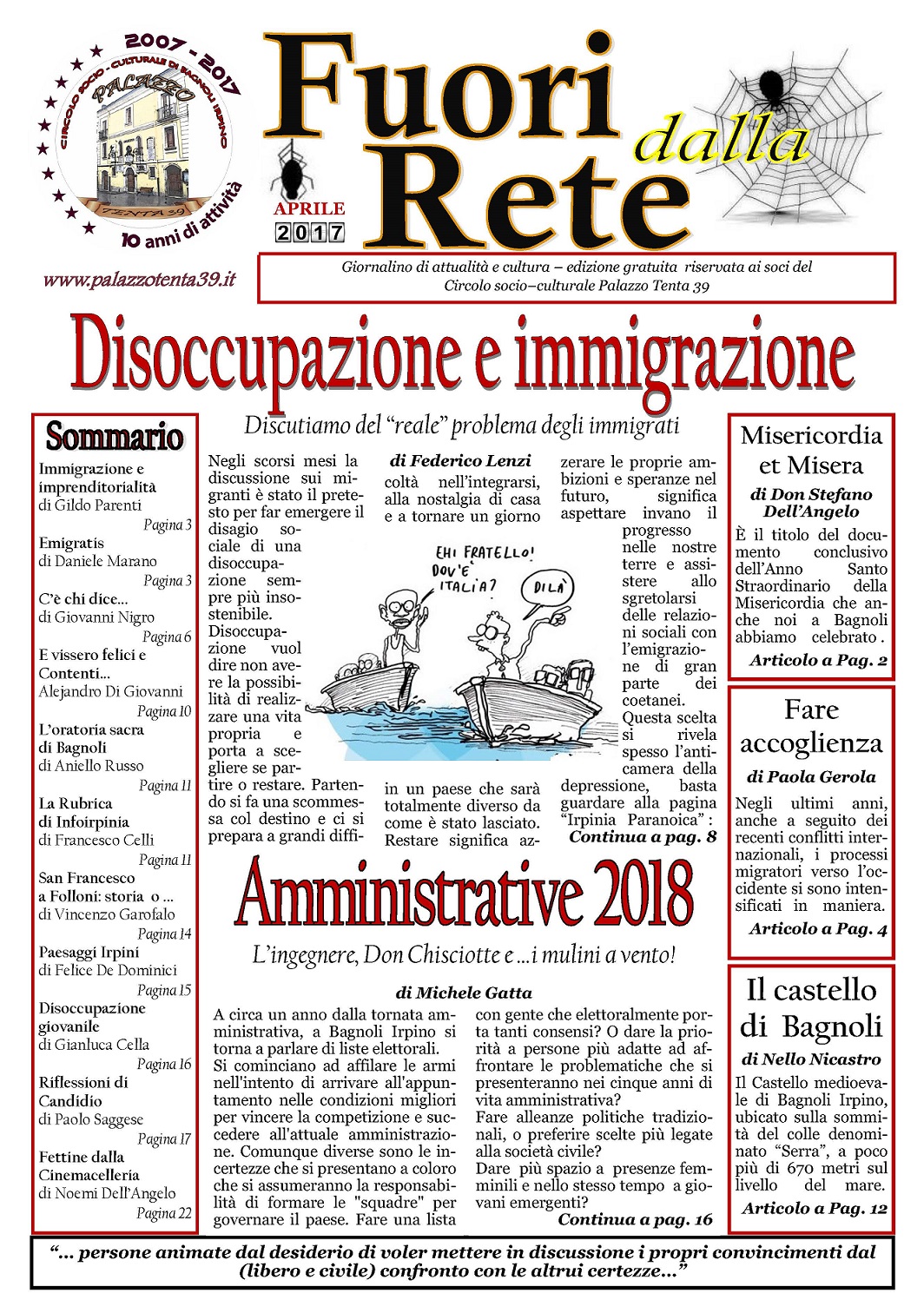 E’ in uscita domenica 2 aprile “FUORI DALLA RETE”, il 2° numero 2017 del giornale di informazione ed approfondimento del Circolo socio-culturale “Palazzo Tenta 39″. La distribuzione, riservata agli associati, avverrà in Piazza Leonardo Di Capua a Bagnoli Irpino a partire dalle ore 10:00. In caso di pioggia i giornali verranno consegnati all’interno dei locali del Bar Laceno, in prossimità dell’edicola.