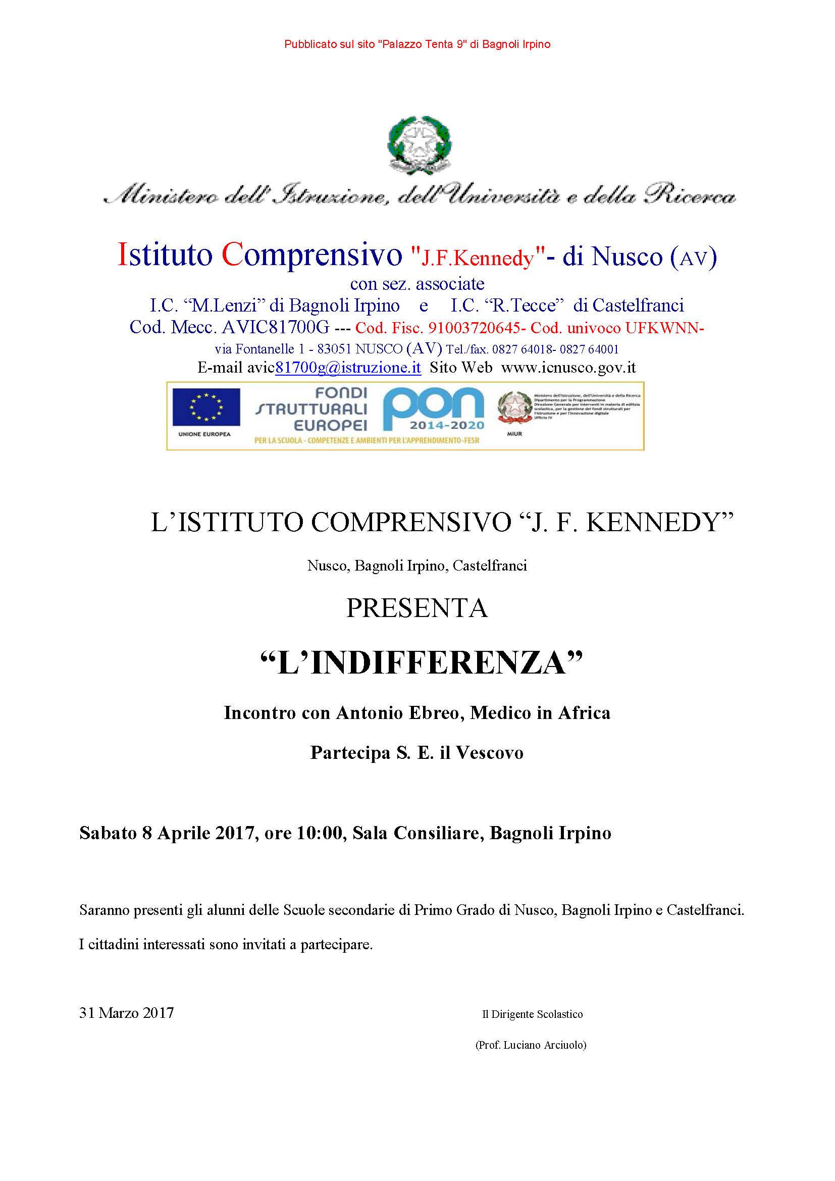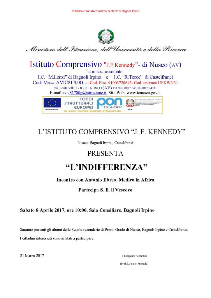 L’Istituto Comprensivo “J. F. Kennedy” di Nusco Bagnoli Irpino e Castelfranci, presenta “L’INDIFFERENZA”, incontro-dibattito con Antonio Ebreo, Medico in Africa. L’appuntamento è per Sabato 8 Aprile 2017, ore 10:00, presso la Sala Consiliare in Via Roma a Bagnoli Irpino.