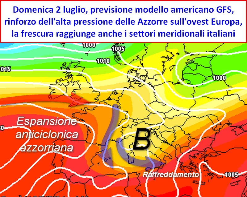 Intanto fra sabato 1 e domenica 2 luglio le temperature diminuiranno sensibilmente anche sulle regioni meridionali e nello stesso tempo qualche fenomeno sparso potrebbe verificarsi nelle zone interne del centro-sud.