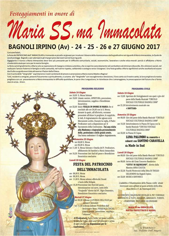 Carissimi fedeli, con la festa del PATROCINIO dell’ IMMACOLATA la comunità tramanda ai piccoli e ai giovani il dovere della riconoscenza e della gratitudine nei riguardi di Maria Immacolata, secolare protettrice di Bagnoli, e adempie gli impegni presi dai nostri avi.