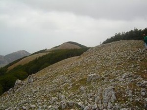 La fontana della Tronola come al solito immagine fissa di un viaggio-ricordo mi riappare davanti e con il suo gocciolio sottile riempie le bottiglie che vi portiamo ogni volta e noi beviamo quell’acqua come un filtro, un elisir che ci proteggerà lungo il cammino. Il cielo umidissimo, le goccioline d’acqua si tramutano in sudore e solo di tanto in tanto la “nostra stella” fa capolino, ma quando si è già ad altezze rilevanti e sopratutto alla quota magica di 1100, su un altopiano a te noto è impossibile tirarsi indietro. Il cammino a differenza del solito non parte dal duro asfalto ma per ferma decisione del collega Walter si sosta dinanzi ai tavolini e alla fresca fontana del Campeggio Zauli, posto divenuto ormai familiare e dal sapore ormai antico. Gli alberi iniziano ad avere una “faccia” stanca, c’è già chi si fa la tinta e inizia a mostrare ciocche colorate vanitosamente, altri invece ostentano giovinezza e sopratutto potenza ma si percepisce che sono al calar della loro eccellenza. Le pietre della carraia diventano molto grigie, la luce cala, il bosco si infittisce e il sentiero come ovvio si perde tra i faggi mentre il vallone attraversato il martedì comincia a divenire tetro. Il caldo avvolge il bosco, lo riusciamo a vedere con gli occhi e sopratutto ci rendiamo conto di quando ci abbracci, ma non è una fusa amichevole. Dopo tutto però, la natura ti accoglie e ti respinge, bisogna saperla conoscere ed è necessario assecondarla e farvi amicizia e probabilmente le “lamentele” di un nostro amico disprezzante di rami e foglie non fanno altro che accentuare questo astio. I tornanti si inerpicano e la strada sembra sempre più coperta come se dall’alto qualcuno si fosse smosso i “capelli” che però vengono puliti più in alto dai più giovani che nella loro tenera età si raggruppano ai bordi della mulattiera per scherzare con noi. Ovviamente il tratto è come l’altra volta affascinante, l’unica acqua rimasta giù si nota come una piccola chiazza e Giamberardino ci saluta di nuovo volgendo a noi però lo sguardo torvo e nervoso. La luce è praticamente sorpassata dalla nuvolaglia e al fermarsi del caldo, il vento freddo ci raggiunge per sollevarci ma d’improvviso la pioggia ci prende di sorpresa. Il tempo cambia, l’autunno si assapora ancor di più e finalmente proviamo le attrezzature di emergenza. Scavalchiamo i rami che ci sgambettano e usciamo allo scoperto con le mantelline ed i coprizaini e osservando quelle che io definisco “gobbe” e non creste ci avviamo su quel “bruco” roccioso per raggiunger il suo addome curvo verso l’alto nel momento di massimo sforzo. Il passaggio iniziale è allo scoperto ma subito incontriamo la presenza di un boschetto sul costone, all’inizio non concentrati ci fermiamo ma come un lampo si accende l’idea di attraversare un albero bruciato dai fulmini e superata quella porta il terreno si “batte” come un vialetto di gnomi o elfi nel verde e nella pace di un caratteristico boschetto. Il regno della tranquillità che si aggiunge all’uscire del sole che ci riscalda e ci costringe a togliere ciò che avevamo indossato per proteggerci dall’acqua.