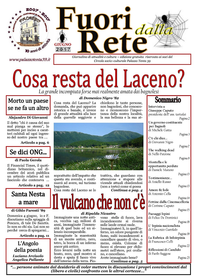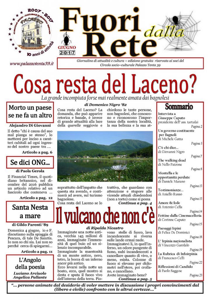 E’ in uscita domenica 25 giugno (Festa dell’Immacolata) “FUORI DALLA RETE”, il 3° numero 2017 del giornale di informazione ed approfondimento del Circolo socio-culturale “Palazzo Tenta 39″. La distribuzione, riservata agli associati, avverrà in Piazza Leonardo Di Capua a Bagnoli Irpino a partire dalle ore 10:30.
