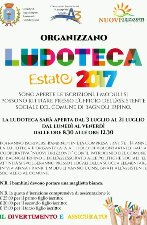 Il comune di “Bagnoli Irpino” Assessorato alle Politiche Sociali, in collaborazione con il Consorzio dei Servizi Sociali “Alta Irpinia” e la cooperativa “Nuovi Orizzonti”, organizza la Ludoteca Estate 2017. L’iniziativa è rivolta ai bambini in età compresa tra i 3-14 anni. La ludoteca inizierà il 03 luglio per terminare il 21 luglio, tutti i giorni dal lunedì al venerdì, dalle ore 8.30 alle ore 12.30. Le attività si svolgeranno presso i locali delle scuole elementari in Via Anna Frank.