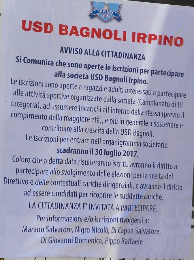Si comunica che sono aperte le iscrizioni per partecipare alla società USD Bagnoli Irpino.