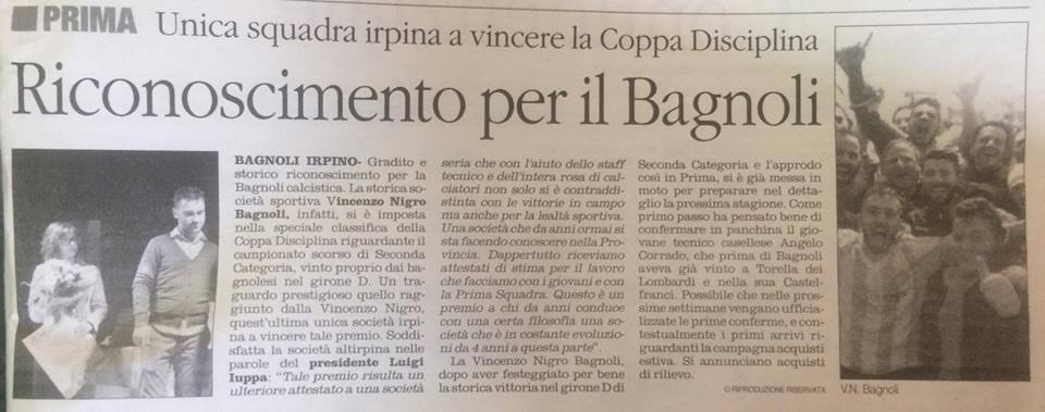 Gradito e storico riconoscimento per la Bagnoli calcistica. La storica società sportiva Vincenzo Nigro Bagnoli, infatti, si è imposta nella speciale classifica della Coppa Disciplina riguardante il campionato scorso di Seconda Categoria, vinto proprio dai bagnolesi nel girone D.