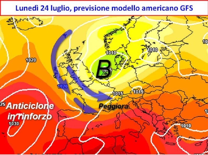 Da lunedì 24 luglio al nord si faranno vivi i primi temporali che si annunciano anche di forte intensità. Nelle suddette zone le temperature subiranno una decisa diminuzione. Il centro-sud resterà in attesa del peggioramento che dovrebbe arrivare fra martedì 25 e mercoledì 26 luglio.