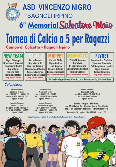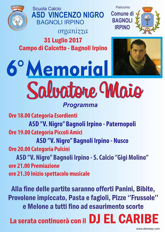 La Scuola Calcio Asd Vincenzo Nigro Bagnoli, con il patrocinio del Comune di Bagnoli Irpino, organizza per lunedì 31 luglio 2017 presso il Campo di Calcetto in Piazza F.lli Rosselli il “6º Memorial Salvatore Maio“.