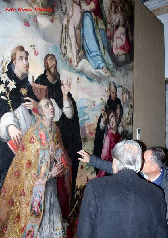 Osservata l’opera nella sua sede attuale, (tra l’altro i supporti metallici che sostengono l’opera sono del restauratore che attende ancora di poterne rientrare in possesso), al signor Franco Moscariello sono state poste alcune domande sullo stato attuale dell’opera e a cosa va incontro col passare del tempo in un simile ambiente. Ci ha rassicurato che fortunatamente ad oggi l’opera è ancora integra e ben aderente al legno e non è invasa da tarli, in quanto i fori presenti hanno tutti un colore scuro, segno che sono fori vecchi già trattati in passato con prodotti antitarlo. Ovviamente non è quella attuale la sede ideale per l’opera in quanto all’ interno della chiesa c’è un tasso di umidità pari all’85%, (rilevato dal misuratore apposto vicino alla pala d’altare), macchie di umidità sulle pareti e una scarsa ventilazione. Tutti sintomi che se non curati potrebbero in breve tempo rovinarla, bisognerebbe quantomeno aprire ogni tanto la chiesa per un ricambio d’aria.