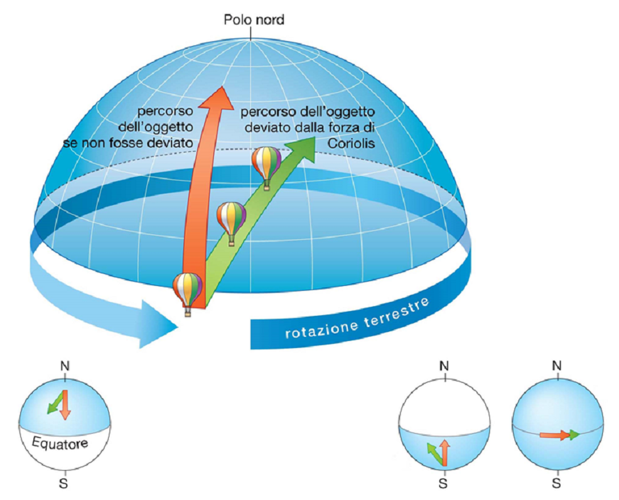 La forza di Coriolis è una forza apparente alla quale sono soggetti tutti i corpi che si muovono rispetto alla superficie terrestre ed è dovuta alla rotazione della Terra intorno al proprio asse. Un oggetto che si muova liberamente sulla superficie terrestre viene deviato dalla sua direzione iniziale a causa della forza di Coriolis. Tale deviazione avviene verso destra o verso sinistra a seconda che l’oggetto si muova, rispettivamente, nell’emisfero settentrionale o in quello meridionale della Terra.