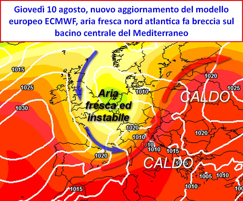 Si evidenzia innanzitutto che la bolla calda, che ha dominato incontrastata nella prima parte dell’estate, tenderà a spostarsi verso l’atlantico. In sostanza il caldo sub-tropicale si limiterà ad interessare la penisola Iberica. Sarà l’alta pressione delle Azzorre a condizionare il tempo sull’Italia e su gran parte dell’Europa. La stessa subirà vari attacchi dalle depressioni nord-europee. Uno di questi lo avremo nei prossimi giorni. Risulterà, ancora una volta, poco produttivo in termini di precipitazioni.