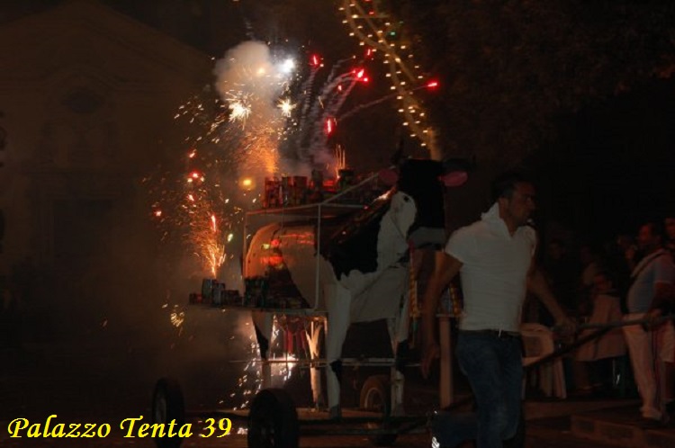 La tradizionale “Vacca di Fuoco”, spettacolo unico nel suo genere, si svolge a conclusione della festa di San Rocco: il simulacro di una mucca, montata su rotelle e riempita fino alle corna di mortaretti, bengala e di ogni altro materiale scoppiettante, viene fatta girare per la piazza Leonardo Di Capua con i fuochi d’artificio accesi, creando così uno sfavillio di colori ed esplosione di mortaretti che lambiscono la folla assiepata ai margini della strada, scatenando entusiasmo e frenetica allegria. La manifestazione è certamente coinvolgente e spettacolare e rappresenta una sorta di rito di catarsi ed iniziazione.