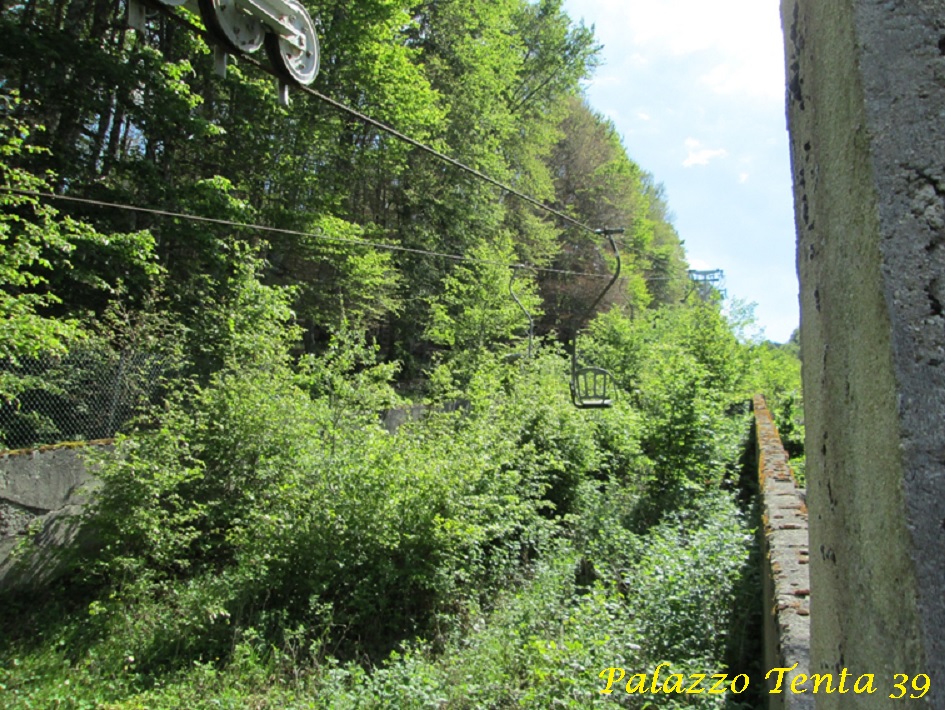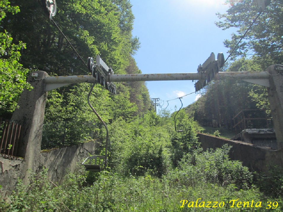 Mi sono infatti recato, a fine maggio di quest’anno, in quel di Marsia, piccola località invernale (un tempo gloriosa) nel comune di Tagliacozzo (AQ), nella Marsica abruzzese. Luoghi fantastici e natura incontaminata, buon cibo e tanta storia (il borgo di Tagliacozzo è uno dei più belli d’Italia) ed anche qui tre impianti fermi ormai a tempo indeterminato. Una storia molto simile a quella del Laceno, anche a Marsia il bacino d’utenza era notevole (1h da Roma e 1h 30′ da L’Aquila), tre gli impianti: una seggiovia monoposto detta “Piccionara” e due skilift al servizio dei principianti, per un totale di quasi 10km di piste. Ma dal 2008 i tre impianti hanno cessato di girare: la seggiovia ha raggiunto la scadenza tecnica e insieme ad essa sono stati fermati anche i due skilift. Da allora giace tutto nel completo abbandono (anche le strutture ricettive e le residenze private) e per i tre impianti pare che il tempo si sia fermato: erba e rovi si sono impadroniti di ciò che erano le piste, le baite, i seggiolini… Gli impianti erano di una società privata, la quale presentando progetti di rilancio degli impianti aveva trovato riscontro negativo da parte dell’amministrazione comunale, dovendo addirittura ricorrere al Tar. Nel frattempo era stata contestata anche la concessione con la quale la società ha operato fin dagli anni ’90. Dal 2010 si sono perse le notizie di questa splendida località, che nel frattempo è decaduta (anche le strade per raggiungerla sono al limite della praticabilità), e nessuno più si è interessato alla questione. In appena 7 anni Marsia è passata da discreto centro invernale ed estivo a poco più di nulla, dove quasi nessuno più si reca neanche per il classico “pic-nic” o qualche escursione.