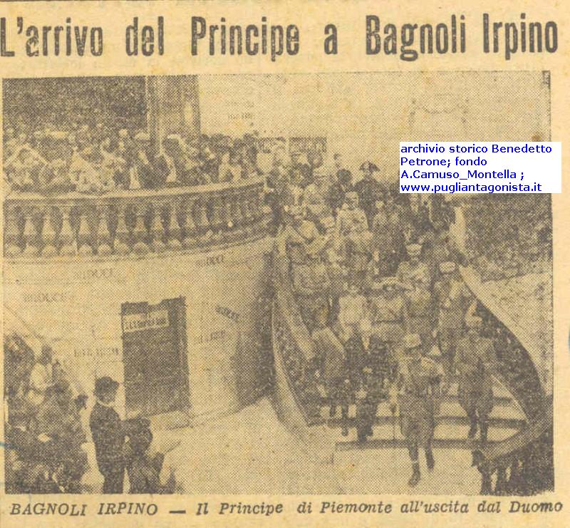 Egli fu salutato dal popolo entusiasta, con schietta manifestazioni di esultanza e si trattenne brevemente in piazza. Poi, in automobile si recò in contrada “Ago” in agro di Montella per assistere ad alcune esercitazioni svolte alla presenza del ten generale Tua comandante della 25esima Brigata di stanza a Napoli. Ivi, fu raggiunto dal podestà di Montella, dott Gambone, che invitò il principe a fermarsi a Montella. Poi S.A.R: si recò ad ispezionare gli accampamenti del 40esimo a Montella e del 15esimo a Cassano , quindi faceva ritorno a Bagnoli verso le 11. 35 recandosi nella chiesa della Collegiata di S Maria Assunta per assistere alla Messa celebrata dall’arciprete –parroco dotto Rubino Carrozza . A piè dello scalone erano ad attenderlo le autorità con a capo il podestà comm Cucci mentre il parroco vestito con i sacri paramenti lo attendeva sulla porta del tempio.