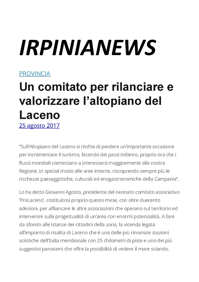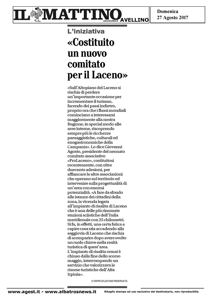 IL MATTINO: COSTITUITO UN NUOVO COMITATO PER IL LACENO – «Sull’Altopiano del Laceno si rischia di perdere un’importante occasione per incrementare il turismo, facendo dei passi indietro, proprio ora che i flussi mondiali cominciano a interessarsi maggiormente alla nostra Regione, in special modo alle aree interne, riscoprendo sempre più le ricchezze paesaggistiche, culturali ed enogastronomiche della Campania».