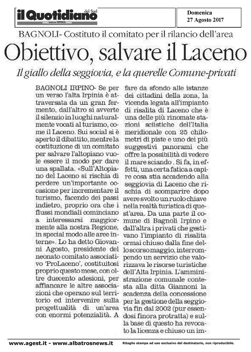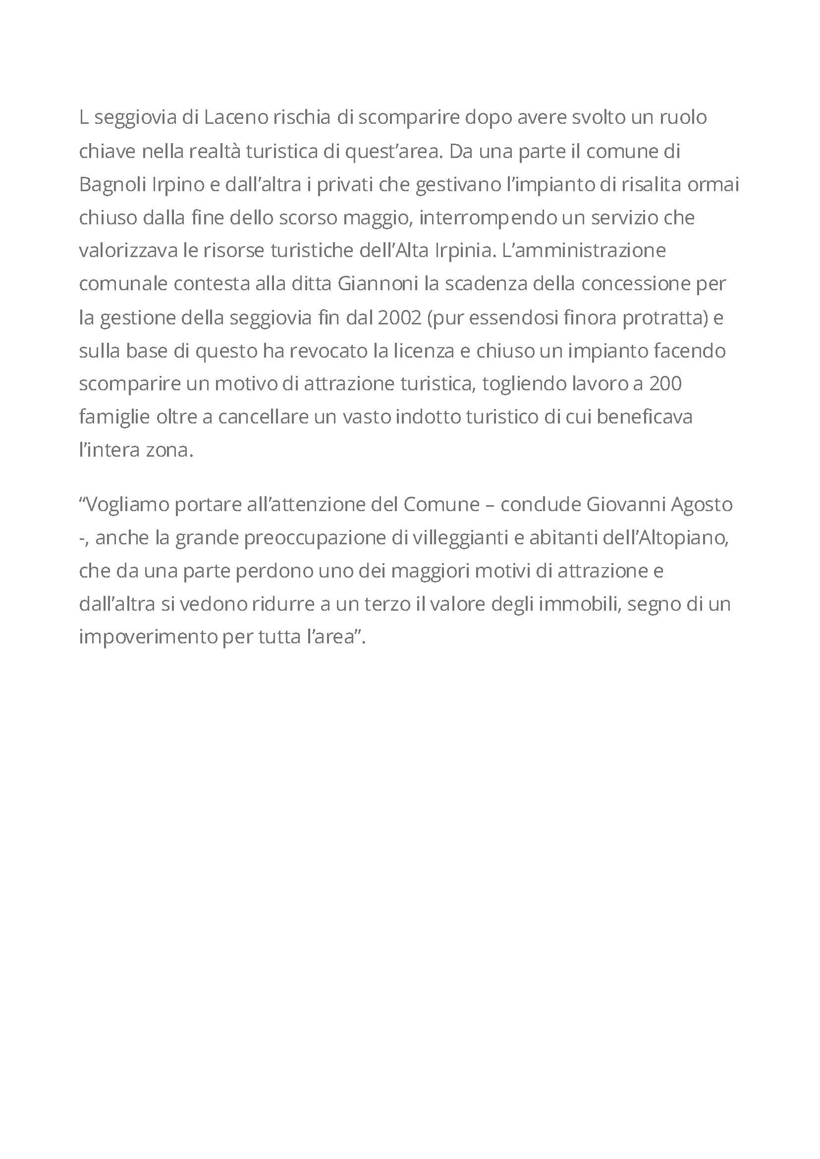 «A fare da sfondo alle istanze dei cittadini della zona, la vicenda legata all’impianto di risalita di Laceno che è una delle più rinomate stazioni sciistiche dell’Italia meridionale con 25 chilometri. Si fa, in effetti, una certa fatica a capire cosa stia accadendo alla seggiovia di Laceno che rischia di scomparire dopo avere svolto un ruolo chiave nella realtà turistica di quest’area. L’impianto di risalita ormai è chiuso dalla fine dello scorso maggio, interrompendo un servizio che valorizzava le risorse turistiche dell’Alta Irpinia».