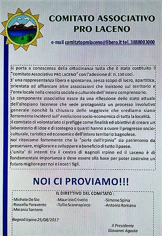 Si porta a conoscenza della cittadinanza tutta che e’ stato costituito il “Comitato Associativo Pro Laceno” con l’adesione di n. 130 soci. E’ una rappresentanza libera e spontanea, senza scopo di lucro, apartitica, orientata ad affiancare altre associazioni che insistono sul territorio e l’ente locale nella crescita sociale e culturale dell’ intero comprensorio.