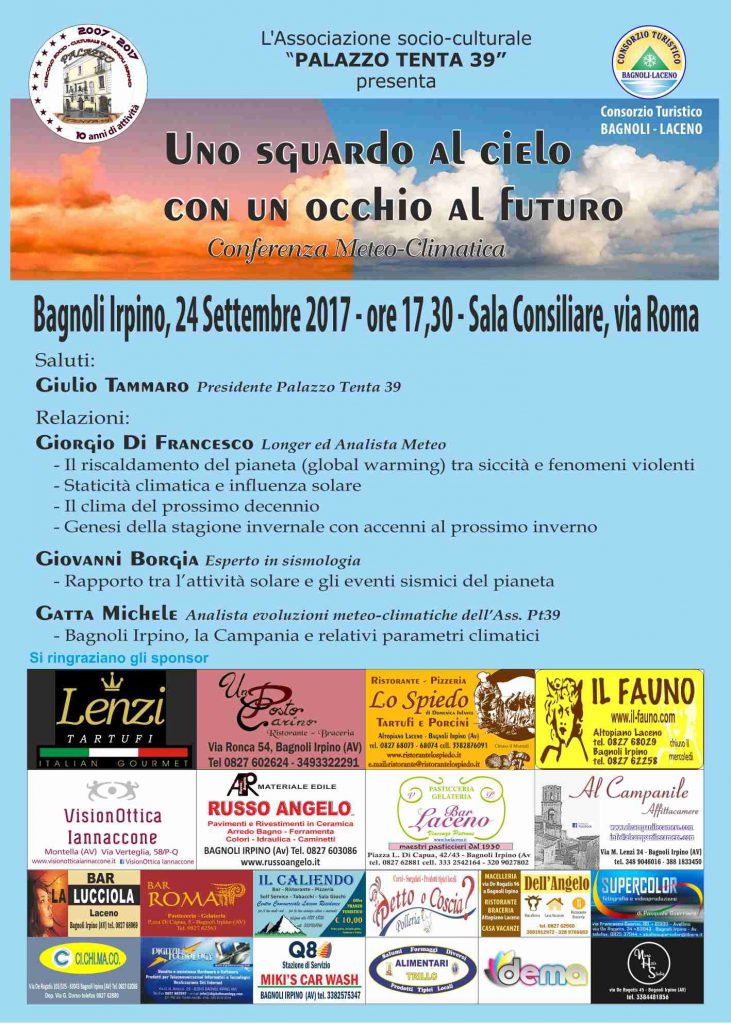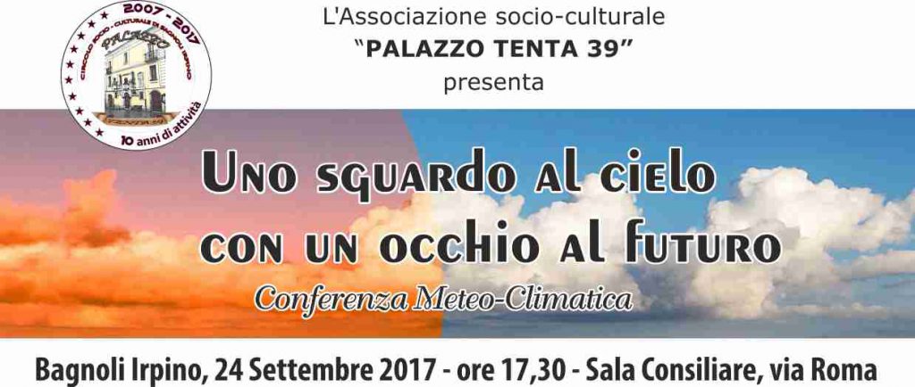 L’associazione socio-culturale “PalazzoTenta39” è lieta di presentare la conferenza meteo-climatica dal titolo “Uno sguardo al cielo con un occhio al futuro”. L’appuntamento è per domenica 24 settembre a Bagnoli Irpino presso la Sala Consiliare in Via Roma, con inizio alle ore 17:30.