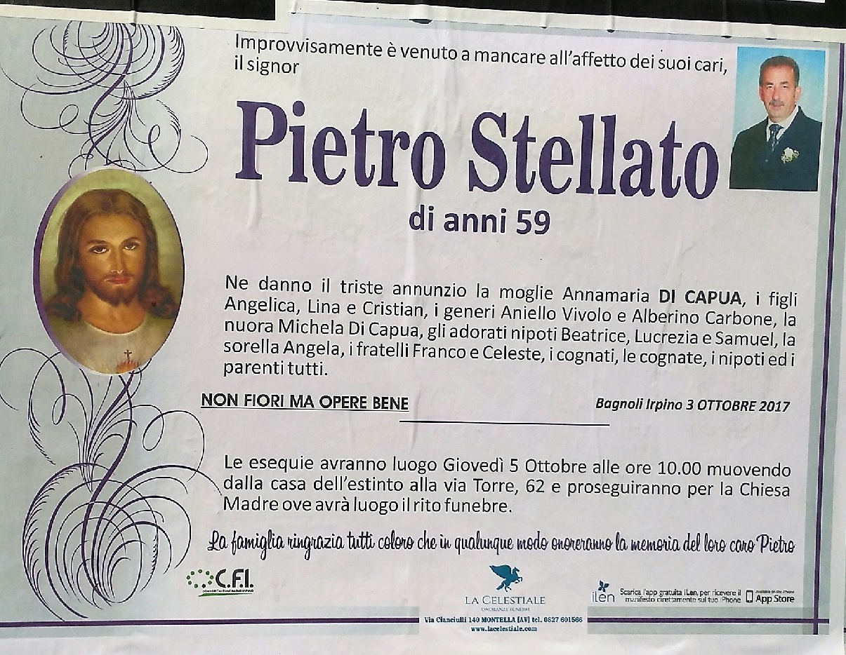 Improvvisamente è venuto a mancare all’affetto dei suoi cari, all’età di 59 anni. Ne danno il triste annunzio la moglie Annamaria Di Capua, i figli Angelica, Lina e Cristian, i generi Aniello Vivolo e Alberino Carbone, la nuora Michela Di Capua, gli adorati nipoti Beatrice, Lucrezia e Samuel, la sorella Angela, i fratelli Franco e Celeste, le cognate, i cognati, i nipoti ed i parenti tutti.