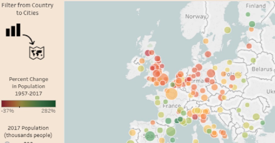 Stando ai dati forniti dal Dipartimento degli Affari Socio-Economici delle Nazioni Unite, calcolando i valori dei due anni di riferimento (1957 e 2017) come media ponderata del quinquennio 1955-1960 e della previsione per il 2015-2020, è evidente che nei diversi paesi si sono registrate tendenze assolutamente eterogenee.Per l’analisi, sono state prese in considerazione le città che nel 2014 registravano un numero di abitanti superiore alle 300 mila unità e, nel grafico che segue, oltre alla visione globale, è possibile avere un focus mirato sulle città di ogni nazione cliccando sul valore della paese di riferimento.