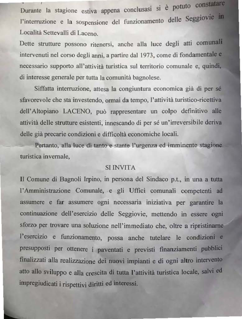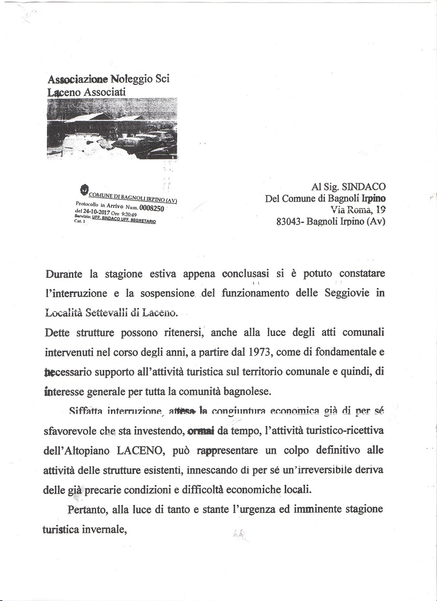 Manifesto-appello sottoscritto da operaratori economici e associazioni di Bagnoli-Laceno e inviato nei giorni scorsi al Comune di Bagnoli Irpino. Altre lettere, dal contenuto analogo, sono state fatte recapitare anche al Concessionario Giannoni.