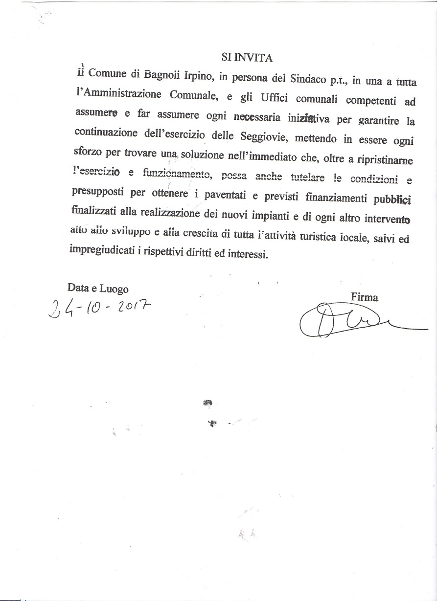 Il Comune di Bagnoli Irpino, in persona del Sindaco p.t., in una a tutta l’Amministrazione Comunale, e gli Uffici comunali competenti ad assumere e far assumere ogni necessaria iniziativa per garantire la continuazione dell’esercizio delle Seggiovie, mettendo in essere ogni sforzo per trovare una soluzione nell’immediato che, oltre a ripristinarne l’esercizio e funzionamento, possa anche tutelare le condizioni e presupposti per ottenere i paventati e previsti finanziamenti pubblici finalizzati alla realizzazione dei nuovi impianti e di ogni altro intervento atto allo sviluppo e alla crescita di tutta l ‘attività turistica locale, salvi ed impregiudicati i rispettivi diritti ed interessi.
