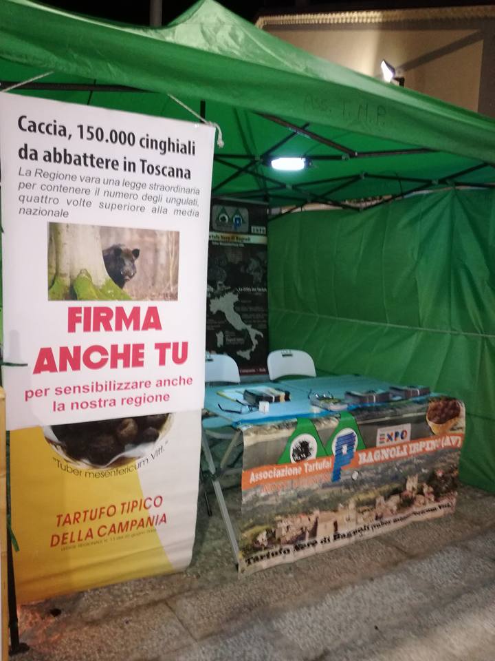 L’ Associazione Tartufai dei Monti Picentini è presente con il suo stand in Piazza Castello, in occasione della 40° Sagra del Tartufo nero di Bagnoli, per la raccolta delle firme da presentare alla Regione Campania per l’abbattimento dei cinghiali.