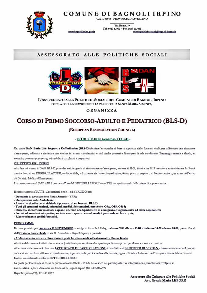 L’Assessorato alle Politiche Sociale del Comune di Bagnoli Irpino, con la collaborazione della Parrocchia Santa Maria Assunta, ORGANIZZA il “Corso di Primo Soccorso adulto e pediatrico” (BLSD European Resuscitation Council)