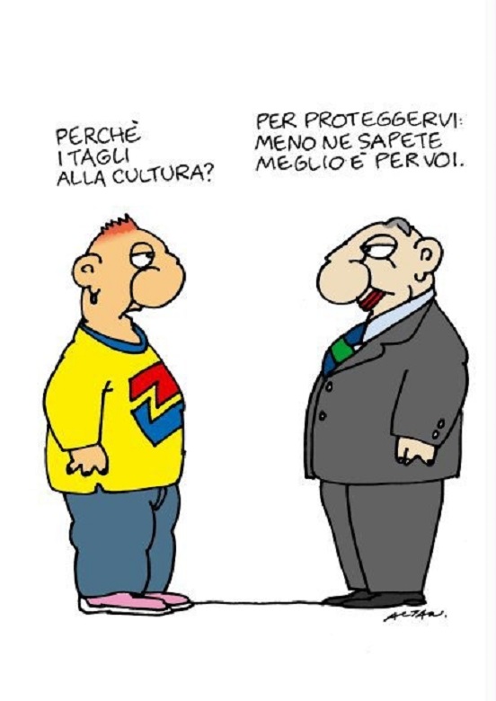Tremonti ha poi avuto modo di ricredersi, al punto che pochi mesi fa ha pubblicato un libro assieme a Vittorio Sgarbi in cui, sostanzialmente sostiene il contrario. Ma quella idea ha comunque fatto strada, se è vero che nel quinquennio 2010 – 2014 la spesa per cultura, istruzione e formazione in Italia è diminuita di un buon 8%. Così il nostro paese ha destinato, nel 2014, solo il 4% del Prodotto Interno Lordo (il famigerato PIL) per cultura e scuola. La media dei paesi OCSE è del 5,2%. La differenza tra 4% e 5,2% sembra, in fondo, poca roba. Ma significa qualcosa come 22 miliardi di euro, circa 44 mila miliardi delle vecchie lire: una enormità. Tenendo conto che nello stesso periodo la spesa pubblica non è diminuita, si capisce che, semplicemente, lo Stato ha preferito disinvestire dalla cultura, destinando i fondi pubblici verso altri capitoli di bilancio (penso al costosissimo acquisto degli F35, aerei caccia da guerra).