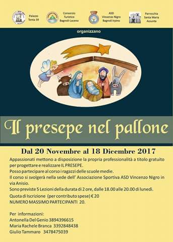 presepeSu iniziativa dell’associazione culturale Palazzo Tenta 39, del Consorzio Turistico Bagnoli-Laceno, dell’Asd Vincenzo Nigro e della Parrocchia Santa Maria Assunta, si organizza un corso di formazione pratico “Il presepe nel pallone”.