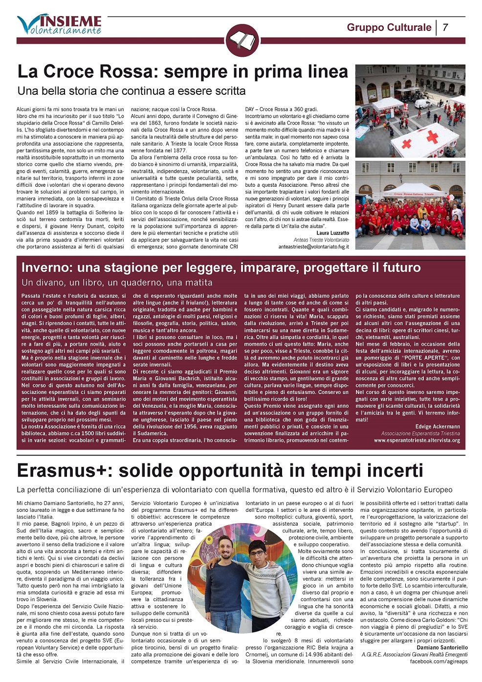(*) Insieme volontariamente, la neo rivista in veste cartacea nata nel 2017 sotto l’egida del Coordinamento territoriale d’ambito-Unione giuliana, realizzata dal Centro servizi volontariato Fvg, coordinata da Domenico Maiello e Cristiano Dosz e curata nella direzione da Pierpaolo Gregori. Uscita trimestrale, formato tabloid da sedici pagine, una prima tiratura di cinquemila copie (distribuzione gratuita) e una sorta di redazione anch’essa costituita esclusivamente da soggetti di buona volontà. Questa la struttura portante di Insieme volontariamente, rivista che si avvale al suo interno di focus indirizzati verso aree tematiche specifiche, ovvero l’ambiente, la cultura, il sistema sociosanitario e il sociale in generale. Insomma, quattro nicchie e altrettante fonti di analisi da parte di tecnici, esperti o volontari appunto impiegati sul campo a Trieste e dintorni.