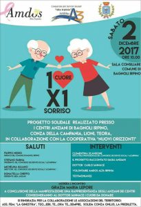 Bagnoli-Un-Cuore-per-un-sorriso-Progetto-Solidale-2017 L’Amdos Alta Irpinia, il Consorzio dei Sewrvizi Sociali Alta Irpinia Ambito 3 ed il Comune di Bagnoli Irpino sono lieti di presentare  il Progetto Sociale  “Un cuore per un sorriso” realizzato dai Centri Anziani di Bagnoli-Conza-Lioni-Teora. L appuntamento a Bagnoli Irpino è per sabato 2 dicembre alle ore 10:00 presso la Sala Consiliare in Via Roma.