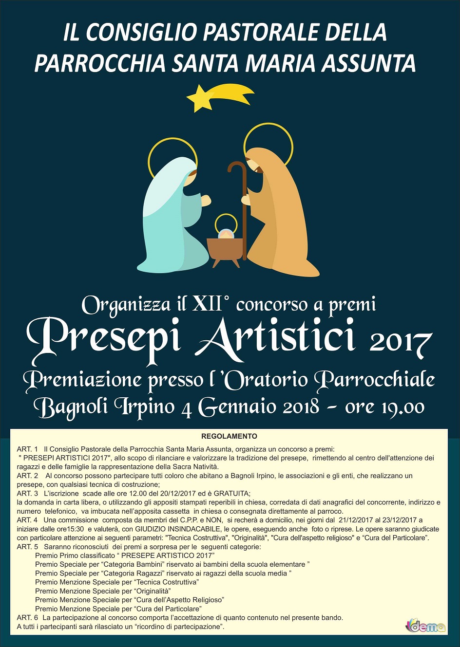 ART. 1 Il Consiglio Pastorale della Parrocchia Santa Maria Assunta, organizza un concorso a premi: “PRESEPI ARTISTICI 2017″, allo scopo di rilanciare e valorizzare la tradizione del presepe, rimettendo al centro dell’attenzione dei ragazzi e delle famiglie la rappresentazione della Sacra Natività.