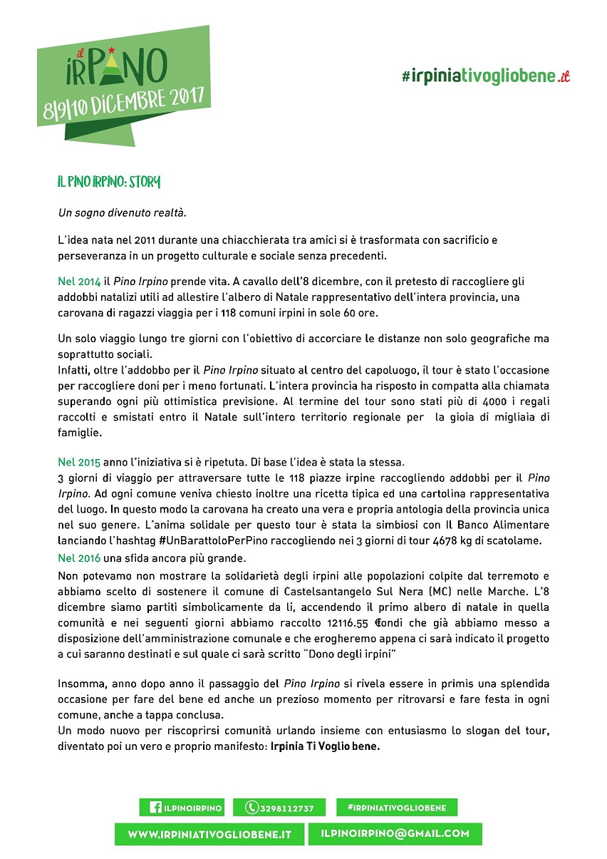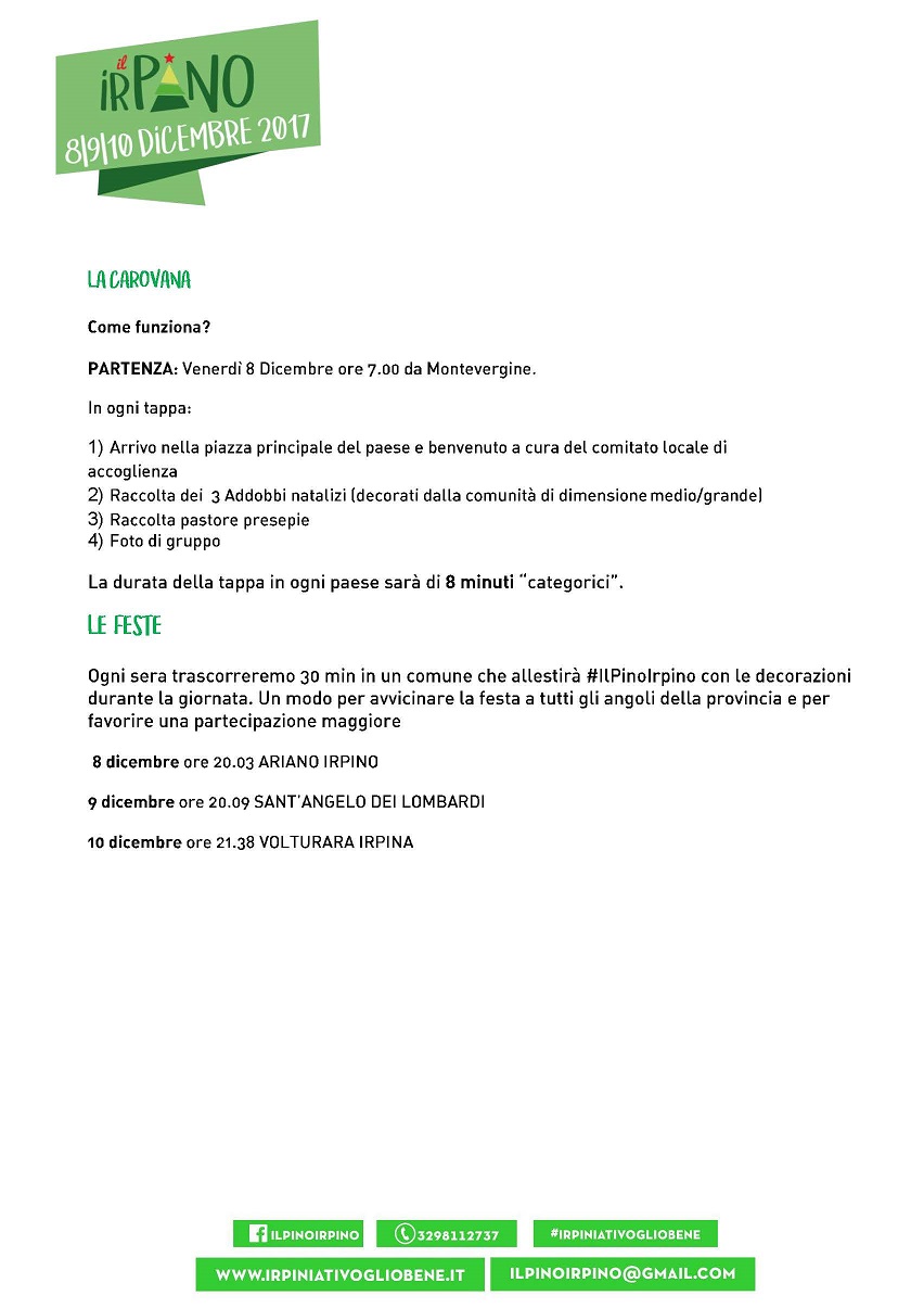 Fervono ora i preparativi per la quarta edizione, che si svolgerà dal 8 all’10 dicembre, con una grande novità. Non un Pino Irpino ma addirittura tre gli alberi che saranno “accesi” simbolicamente dalla carovana al passaggio nei comuni scelti quest’anno, uno ogni sera. Ariano Irpino, Sant’Angelo dei Lombardi per concludere a Volturara Irpina