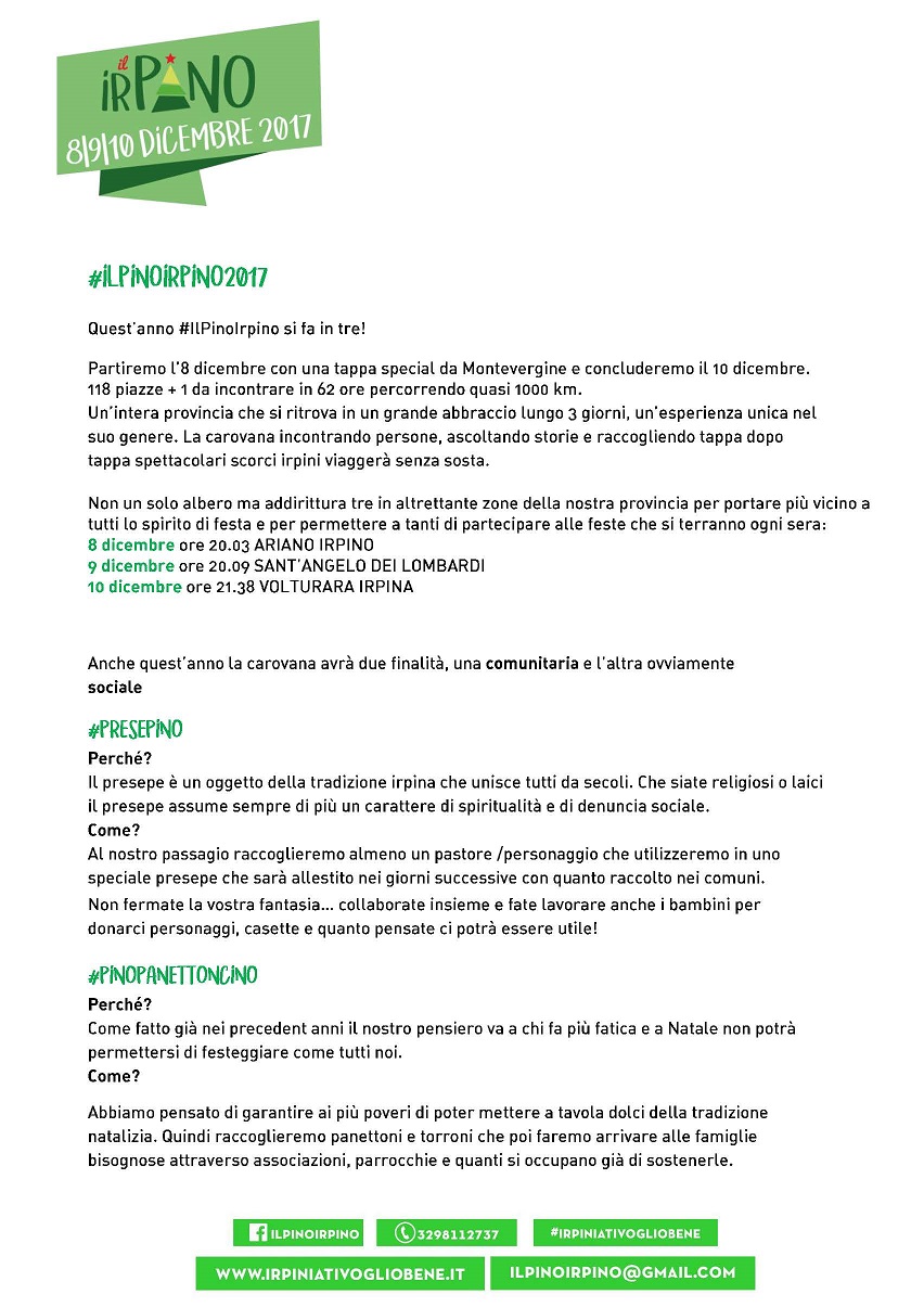Tra le novità di quest’anno #Presepino, raccoglieremo in ogni comune un pastore e chi vorrà anche altre cose utili “fatte a mano” per la realizzazione di un unico presepe interpretato in chiave moderna; “#PinoPanettoncino”, raccoglieremo panettoni, pandori e torroni da donare alle famiglie in difficoltà per fargli vivere un Natale migliore.