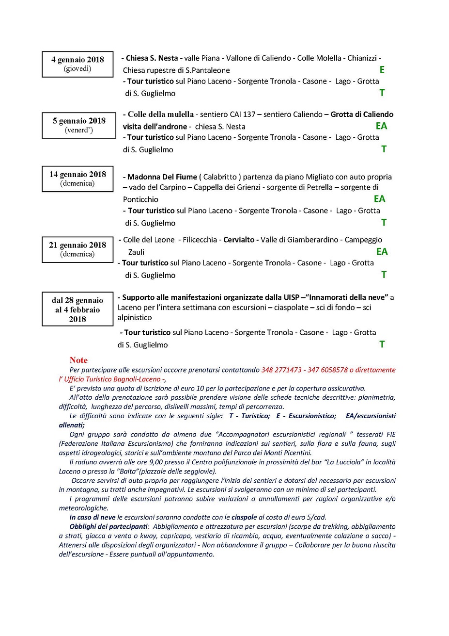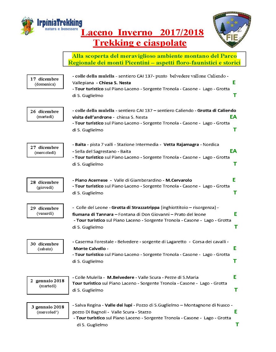 - dal 28 gennaio al 4 febbraio 2018 – Supporto alle manifestazioni organizzate dalla UISP –“Innamorati della neve” a Laceno per l’intera settimana con escursioni – ciaspolate – sci di fondo – sci alpinistico – Tour turistico sul Piano Laceno – Sorgente Tronola – Casone – Lago – Grotta di S. Guglielmo T