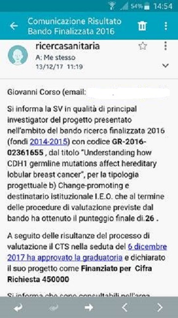 È stato finanziato un progetto di ricerca per il cancro ereditario con 450.000 euro, presentato dal dottor Giovanni Corso al Ministero della Salute da svolgere presso l’Istituito Europeo di Oncologia di Milano, IEO, fondato da Umberto Veronesi.