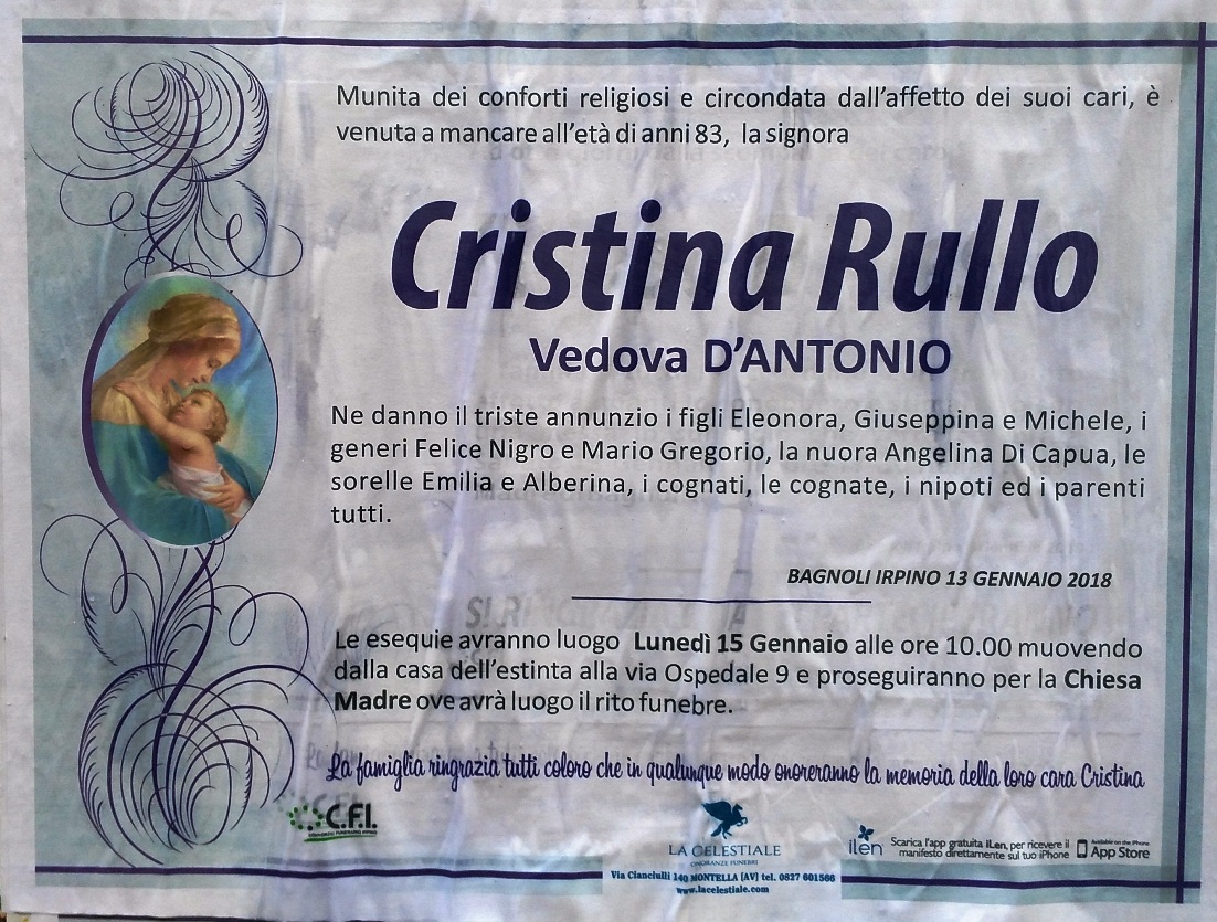 Munita dei conforti religiosi e circondata dall’affetto dei suoi cari, è venuta a mancare, all’età di 83 anni. Ne danno il triste annunzio i figli Eleonora, Giuseppina e Michele, i generi Felice Nigro e Mario Gregorio, la nuora Angelina Di Capua, le sorelle Emilia e Alberina, i cognati, le cognate, i nipoti ed i parenti tutti. Le esequie avranno luogo Lunedì 15 Gennaio 2018 alle ore 10,00 muovendo dalla casa dell’Estinta alla via OSPEDALE,9 e proseguiranno per la Chiesa Madre ove sarà celebrato il rito religioso.