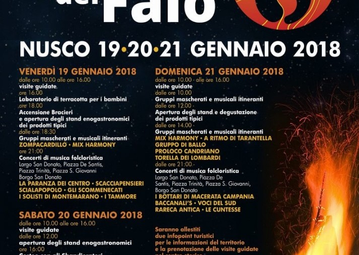 Nusco-Notte-Falo-2018Un rito che si ripete da oltre quattro secoli, una festa che rinnova tradizione e fede e che si proietta nella contemporaneità attraverso una rivisitazione autentica della memoria di una comunità. Un evento che, edizione dopo edizione, si arricchisce di nuovi elementi con l’obiettivo di comporre un mosaico dove trovino spazio antichità e modernità, storia e memoria, ma anche promozione e fruizione turistica di un luogo, di un territorio. Tutto questo è la Notte dei Falò di Nusco (Avellino) che si terrà dal 19 al 21 gennaio prossimi.