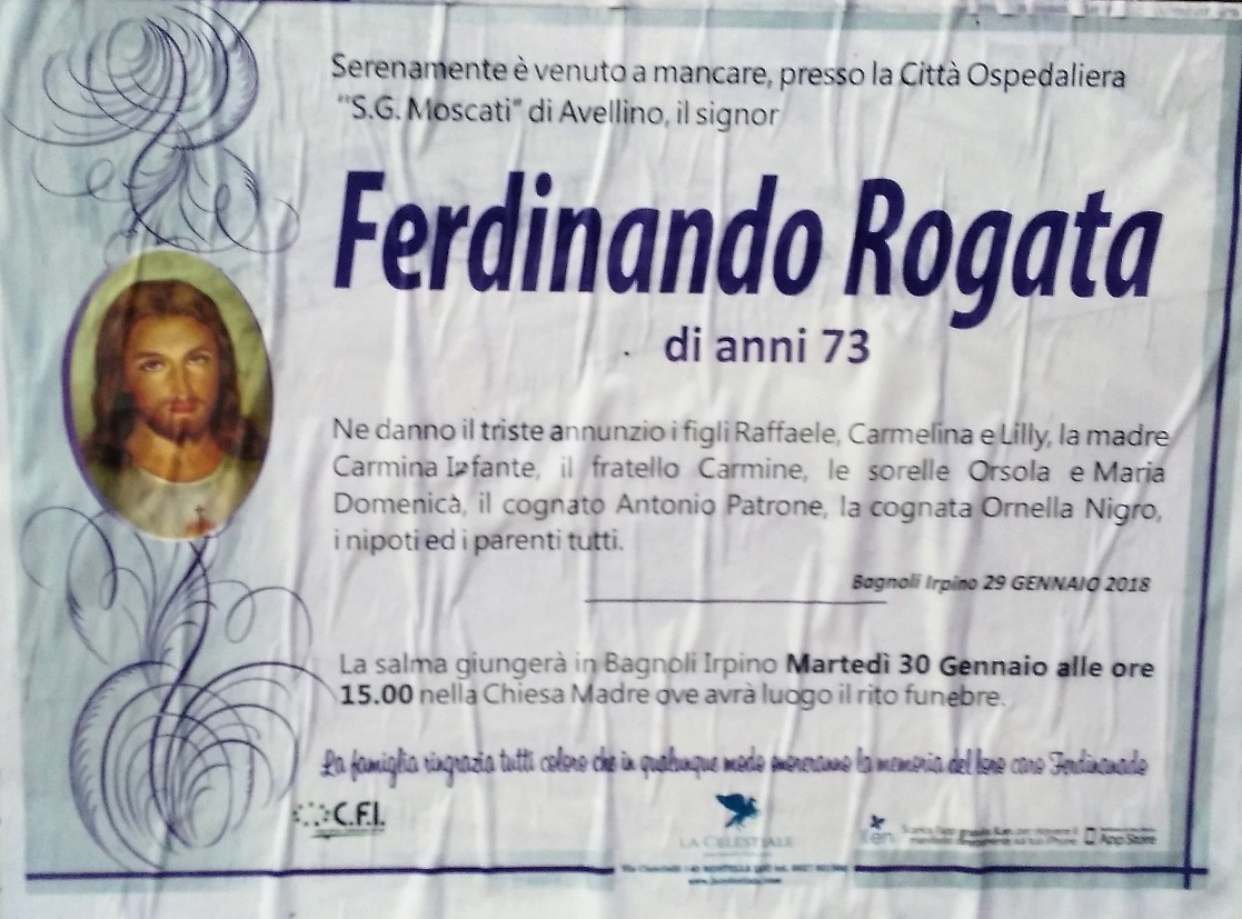 Serenamente è venuto a mancare, presso la Città Ospedaliera S.G.Moscati di Avellino, Ne danno il triste annunzio i figli Raffaele, Carmelina e Lilly, la madre Carmina Infante, il fratello Carmine, le sorelle Orsola e Maria Domenica, il cognato Antonio Patrone, la cognata Ornella Nigro, i nipoti ed i parenti tutti. La Salma giungerà in Bagnoli Irpino Martedì 30 Gennaio alle ore 15,00 nella Chiesa Madre ove avrà luogo il rito religioso. – La famiglia sentitamente ringrazia –