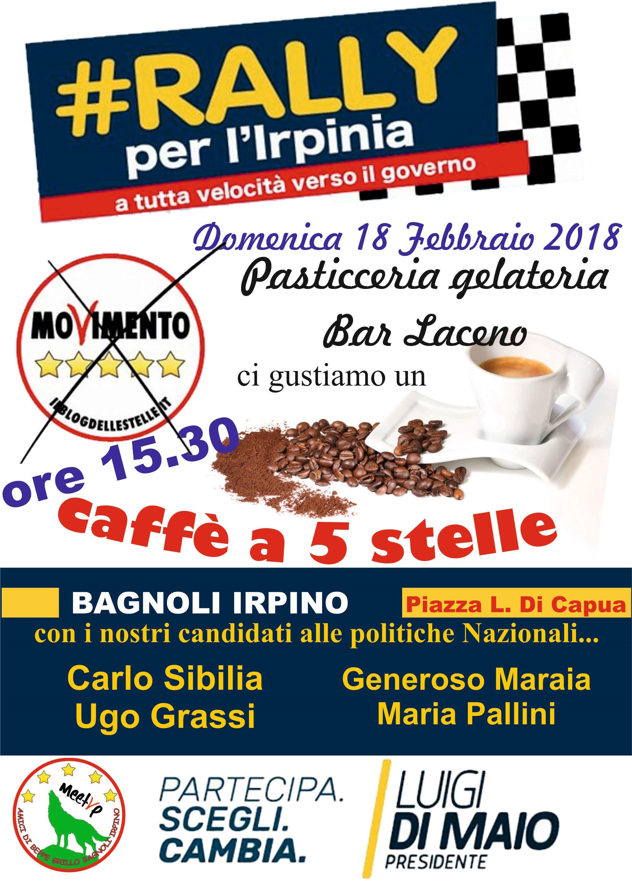 Il Rally per l’Irpinia finalmente fa tappa a Bagnoli Irpino, e lo fa come da consuetudine con il classico “Caffè a 5 stelle”. L’evento si terrà Domenica 18 febbraio alle ore 15:00 presso la Pasticceria-Gelateria del Bar Laceno in Piazza Leonardo Di Capua. Si parlerà del grande Progetto Politico che il Movimento 5 Stelle sta comunicando agli italiani in vista delle elezioni politiche del 4 marzo.